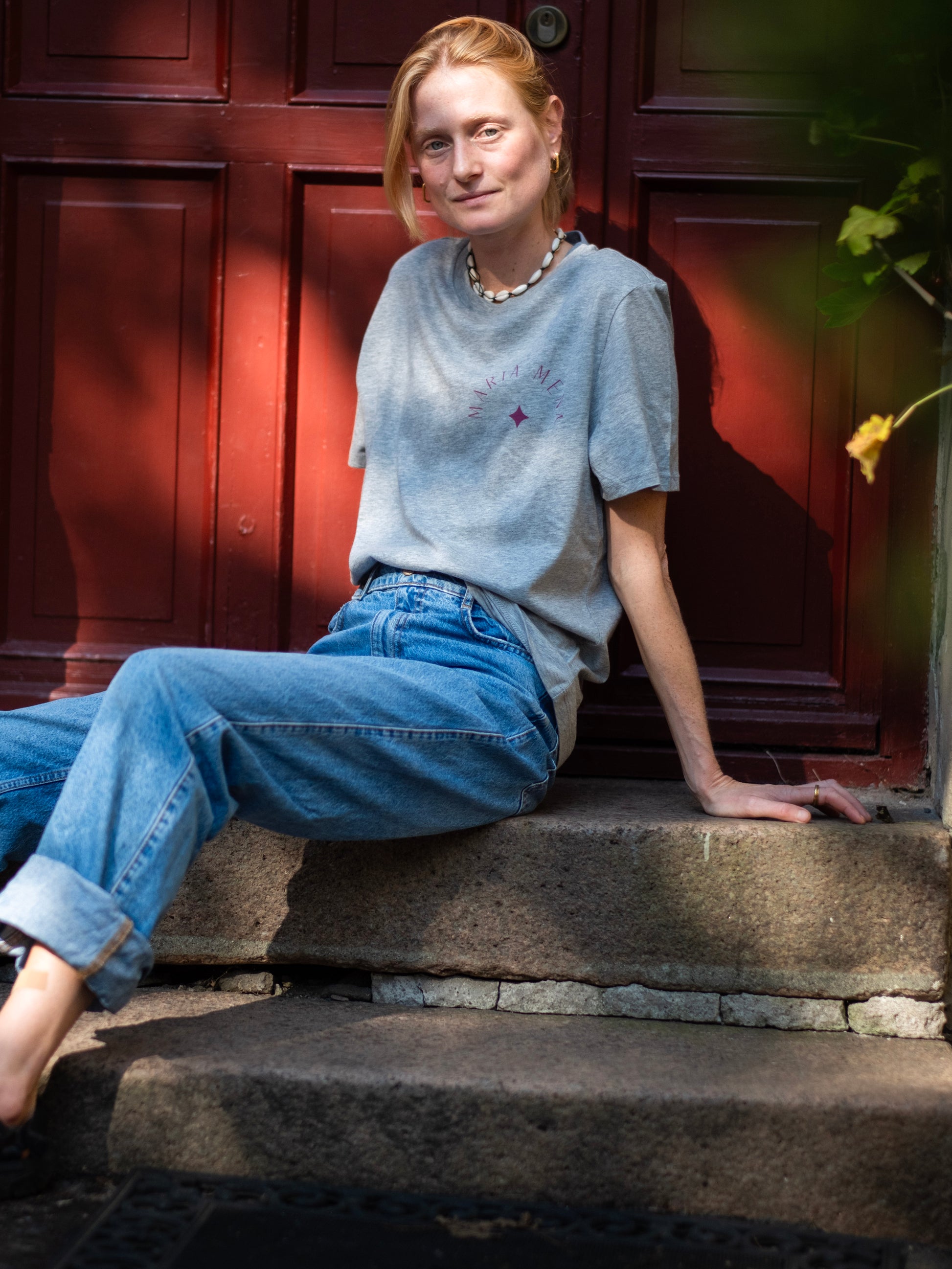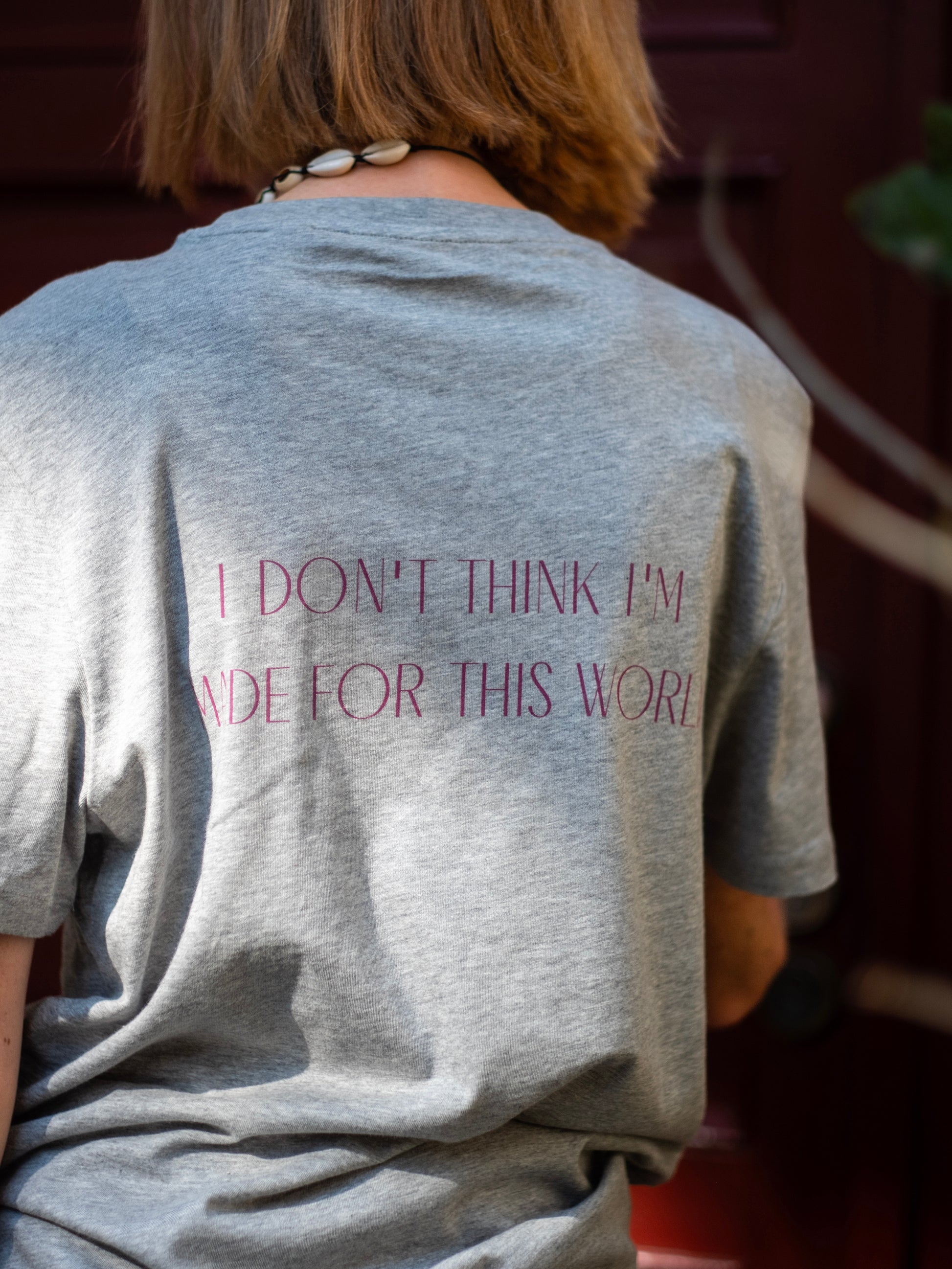Grå t-skjorte med en liten Maria Mena logo på brystet, og tekstlinjen I don’t think I’m made for this world fra låten Till the water runs clear på ryggen.